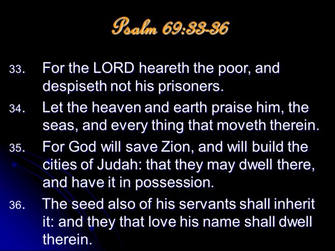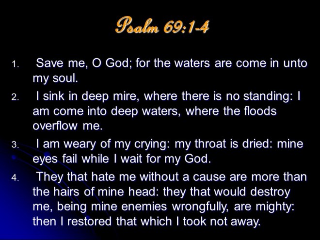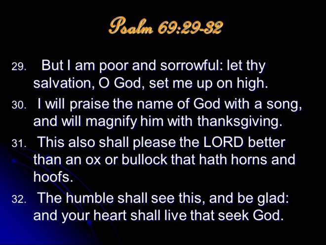Psalm 69, of David. When you get that sinking feeling, this Psalm lifts you back up, “I will praise the name of God with a song, and will magnify him with thanksgiving.”