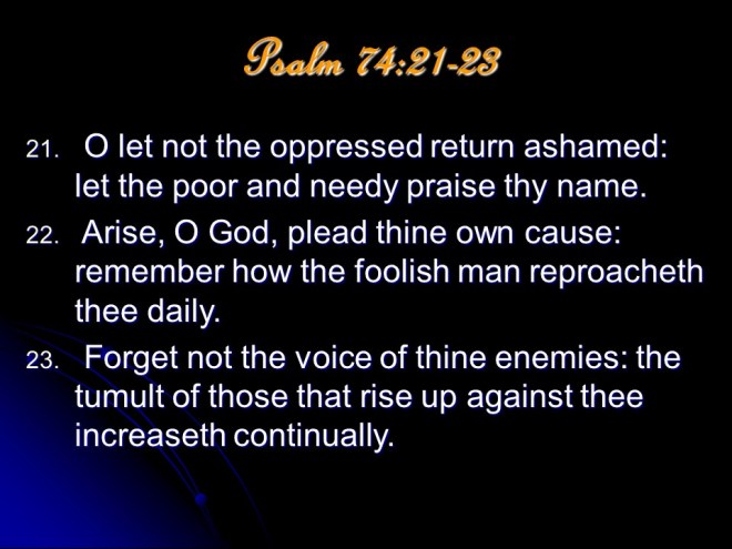 Psalm 74, of Asaph. This Psalm describes the destruction of the Temple. This Asaph may have been penned by a descendant of the earlier musician, or may be prophetic. In any case he asked God to defend His case against the evildoers.