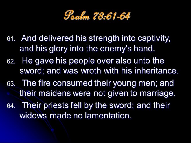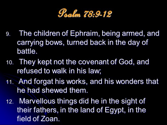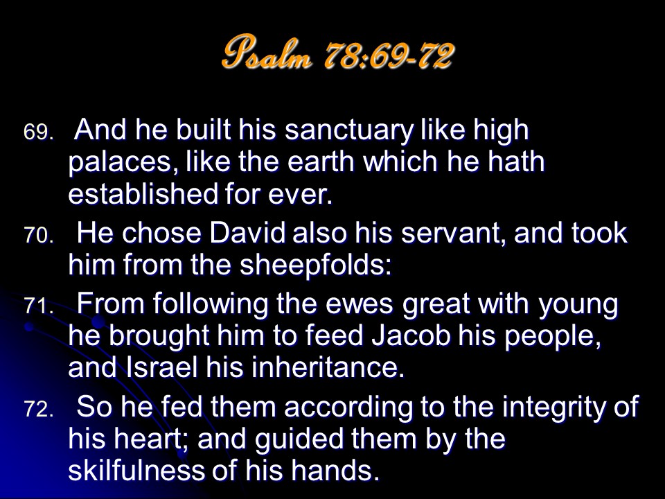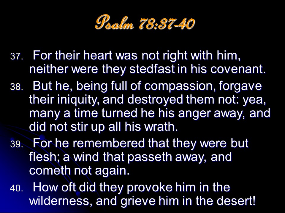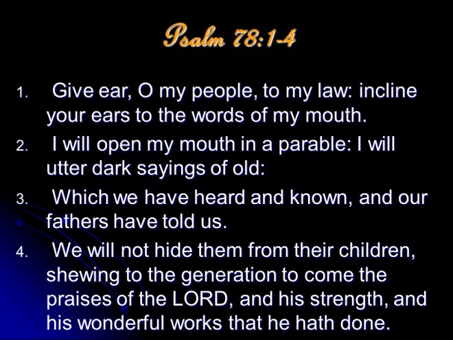Psalm 78, a maskil of Asaph. “This is the longest of the historical psalms. Its lesson is that history must not repeat itself. The people must never again be unbelieving.” (James Montgomery Boice)