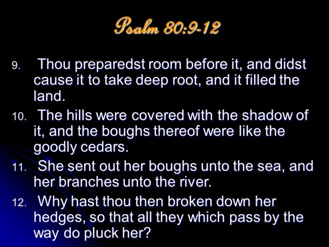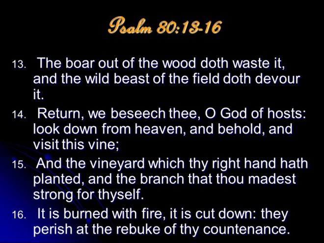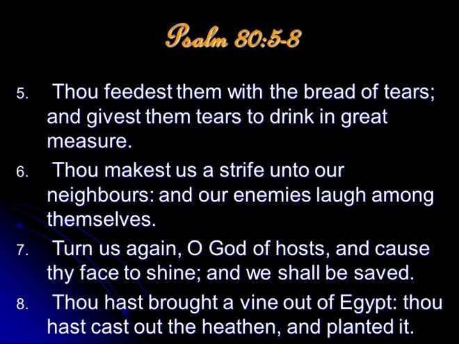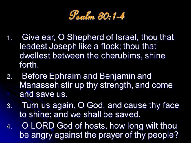 Psalm 80, of Asaph. A prayer for restoration of Israel, mentioning the Shepherd of Israel, a heartfelt and urgent plea.