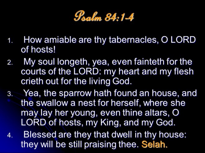 Psalm 84, of the Sons of Korah. The famous 19th century English preacher Charles Spurgeon said Psalm 84 was “to be called The Pearl of Psalms.” He once preached a whole sermon on verse 3: “Yea, the sparrow hath found an house, and the swallow a nest for herself, where she may lay her young, even thine altars, O Lord of hosts, my King, and my God.”