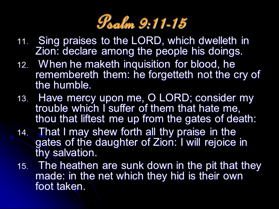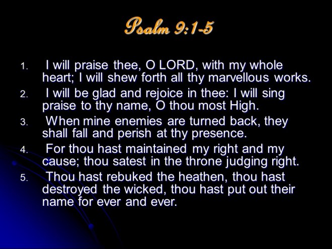 Psalm 9 speaks of God’s faithfulness and the victories of the wicked one are only temporary.