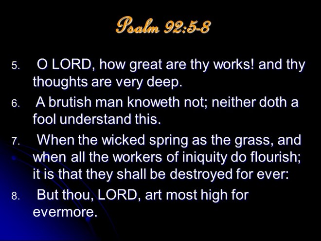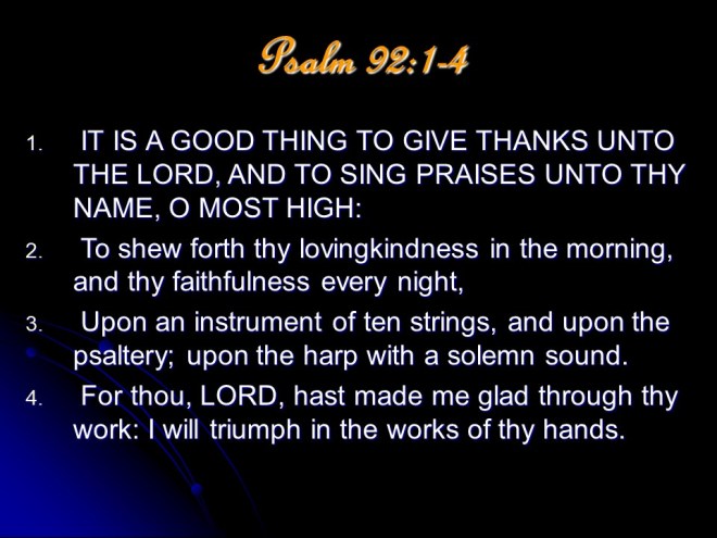 Psalm 92. A Song for the Sabbath day. Give thanks to the LORD. God judges His enemies, and He makes His people flourish.