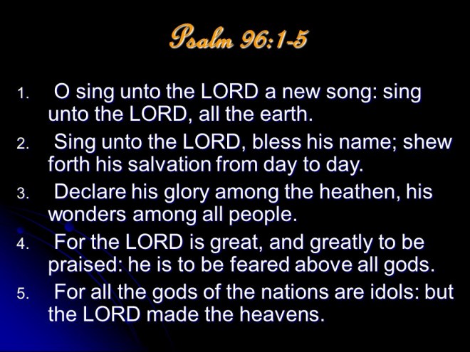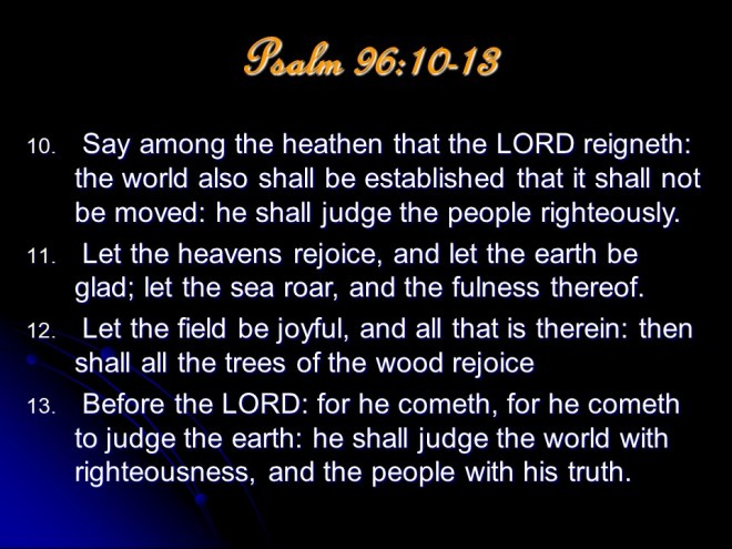 Psalm 96 was written to “declare His glory among the nations“, and ends up with “Let all creation rejoice before the Lord, for he comes, he comes to judge the earth.”