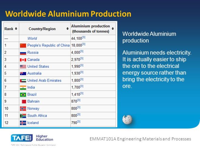 3. Aluminum (or Aluminium as the British and IUPAC call it) China produced 41% of the world’s raw aluminum in 2010, USA produced 4.5%. China’s production was nearly 10 times larger.