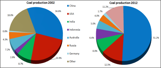 China burned 51.2% of the world’s coal in 2012, USA produced 12.5%. China’s production was more than four times larger. This has now stabilized and was in 2018 47%, because India and the real developing world are increasing their dependence on coal for electricity production, and also for cooking meals.