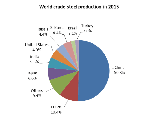 2 Steel production. China produced 50.3% of the world’s crude Steel in 2015, USA produced 4.9%. China’s production was over 20 times larger. Some of this steel was dumped below production cost to crush our domestic low end steel industry. An example: Rolled steel to make steel cans were exported at about $200 a ton, the production cost in the U.S. is more like $400 a ton.