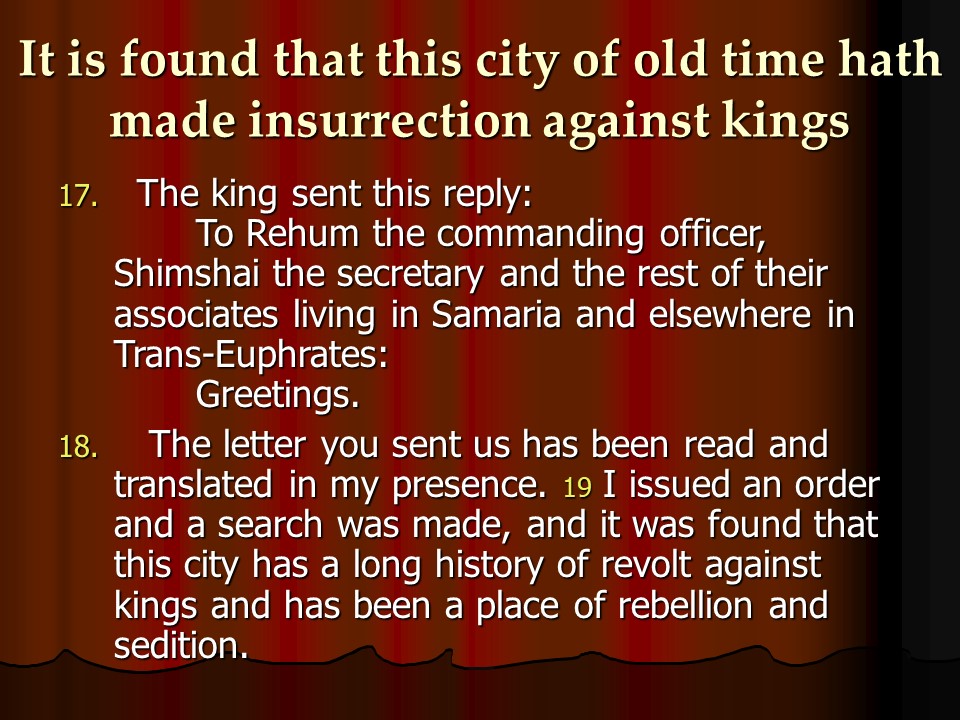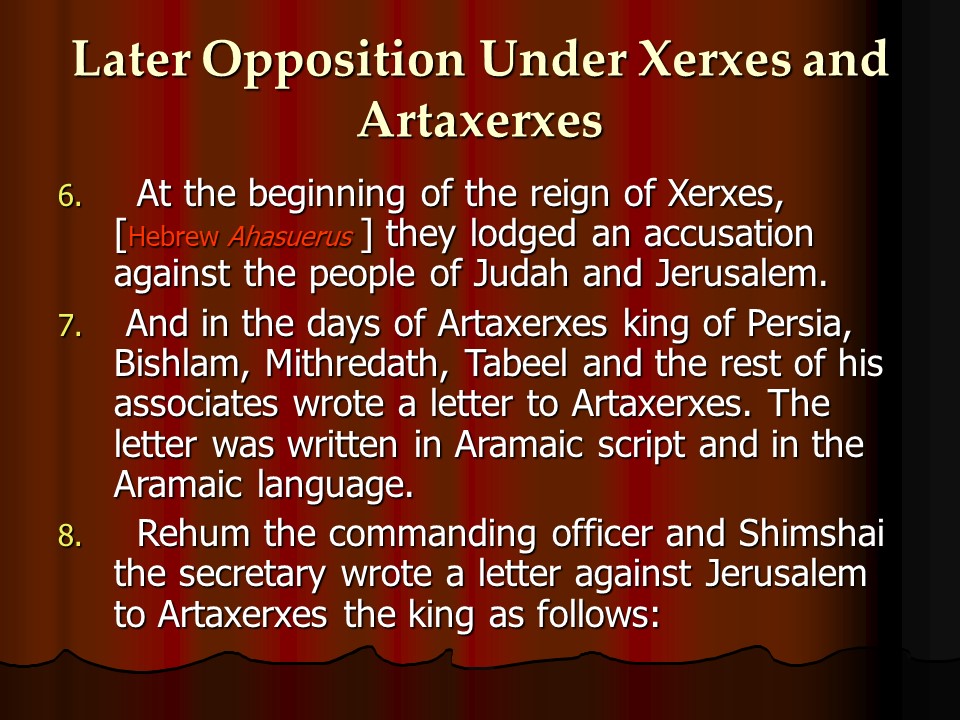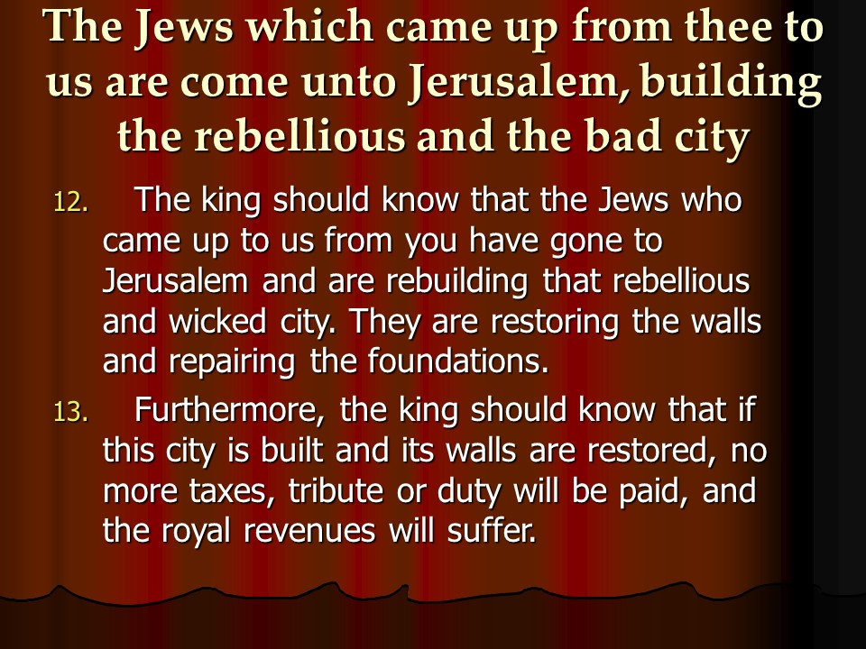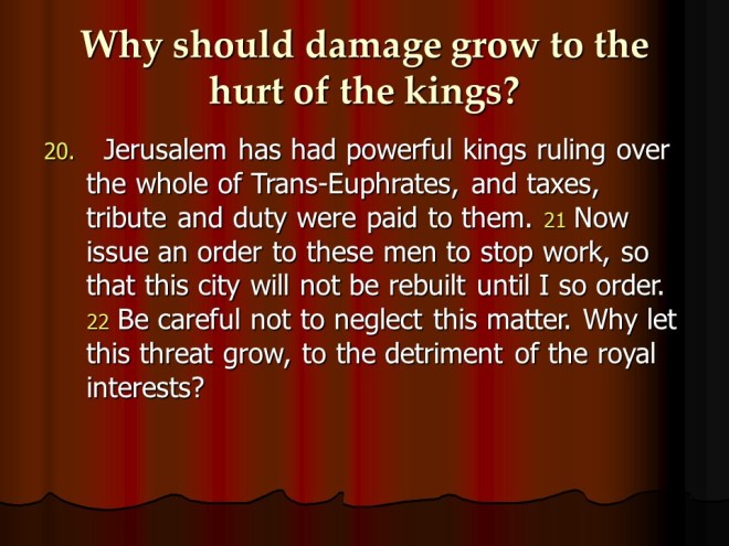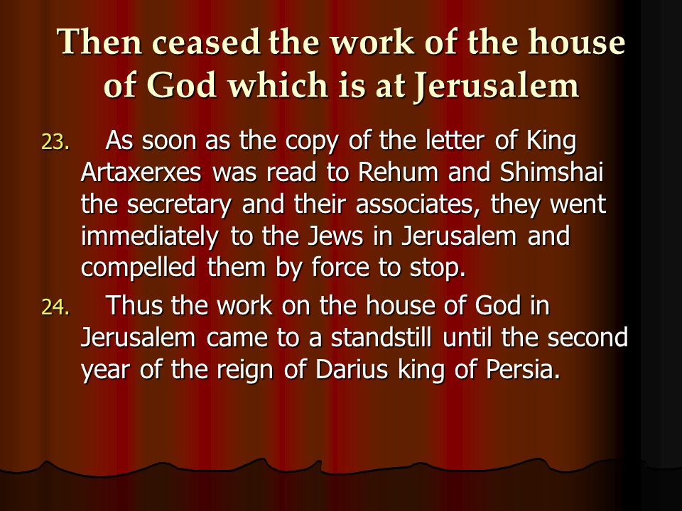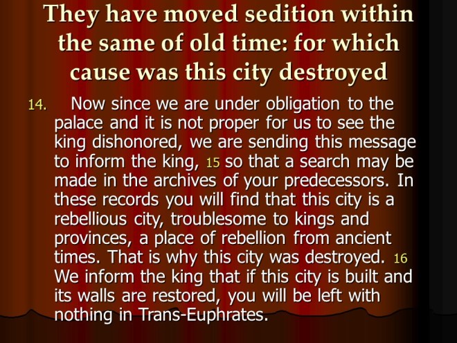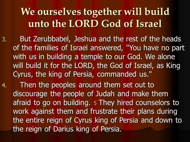 Ezra 4. The resistance to building the Temple was great, and the rebuilding of Jerusalem was successfully opposed (for a while).