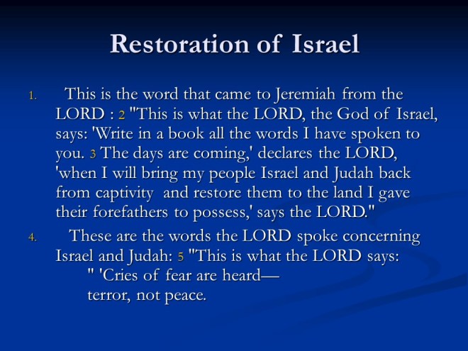 Jeremiah 31 is a most remarkable chapter. Jeremiah, in a dream heard God say “Yea, I have loved thee with an everlasting love” and God continued by promising that the remnant of Israel will be saved. Then, in verse 15 God provided an abrupt change “A voice was heard in Ramah, lamentation, and bitter weeping; Rachel weeping for her children refused to be comforted for her children, because they were not.” Returning to the dream God gave an even more remarkable statement “O thou backsliding daughter? for the Lord hath created a new thing in the earth, A woman shall compass a man.” After this Jeremiah woke up from his pleasant dream. God continued speaking, promising mercy on Ephraim, future prosperity to Israel, and promised the New Covenant: “But this shall be the covenant that I will make with the house of Israel; After those days, saith the Lord, I will put my law in their inward parts, and write it in their hearts; and will be their God, and they shall be my people. And they shall teach no more every man his neighbour, and every man his brother, saying, Know the Lord: for they shall all know me, from the least of them unto the greatest of them, saith the Lord: for I will forgive their iniquity, and I will remember their sin no more.”