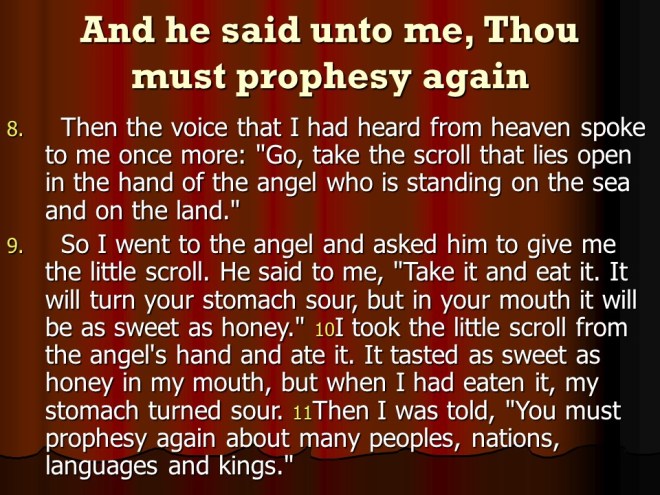 Revelation 10 tells of the mighty angel and the little book. The angel announced there would be no more delay, and by the time of the seventh trumpet all will be set in motion. John is told to eat the little book, and then he was told to prophesy again.