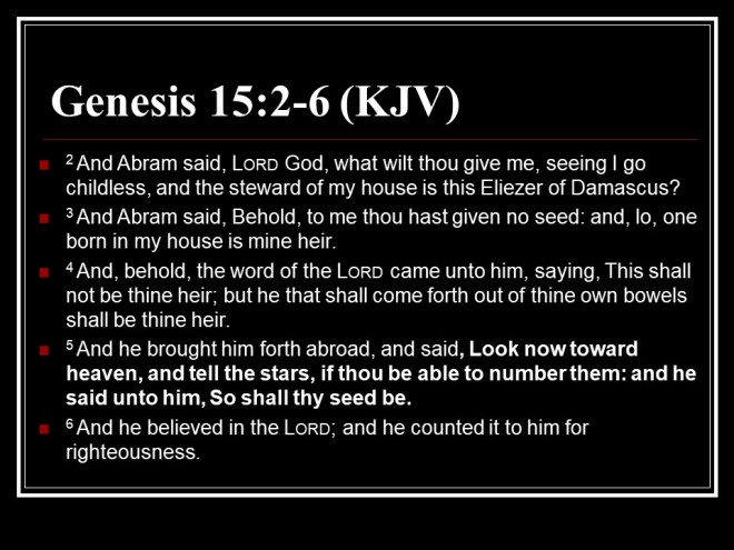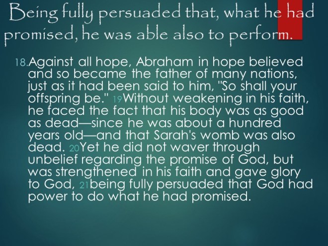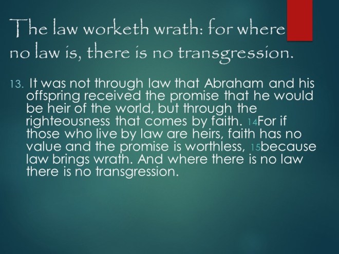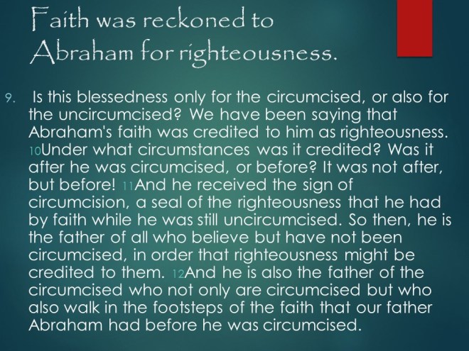 Romans 4. Abraham was justified by faith, not works and definitely not by circumcision. Where there is no law, there is no transgression. Against all hope, Abraham in hope believed, and it was credited to him as righteousness. And “for us also, to whom it shall be imputed, if we believe on him that raised up Jesus our Lord from the dead; Who was delivered for our offences, and was raised again for our justification.”