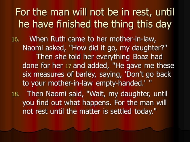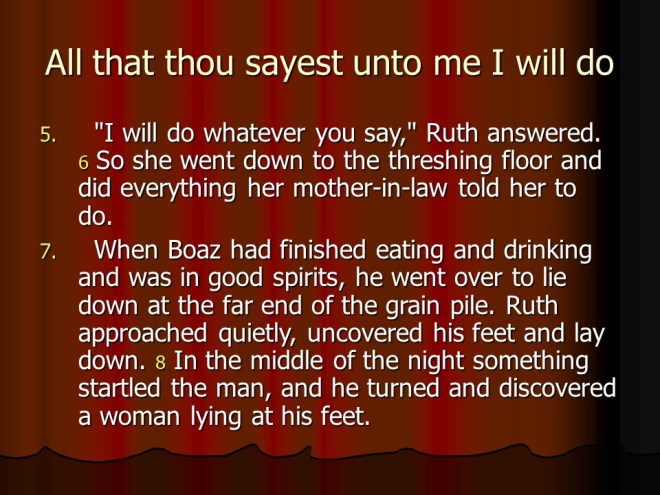 Ruth 4. Boaz redeemed Ruth, and that’s how Ruth came to be in the genealogy of David and Jesus.