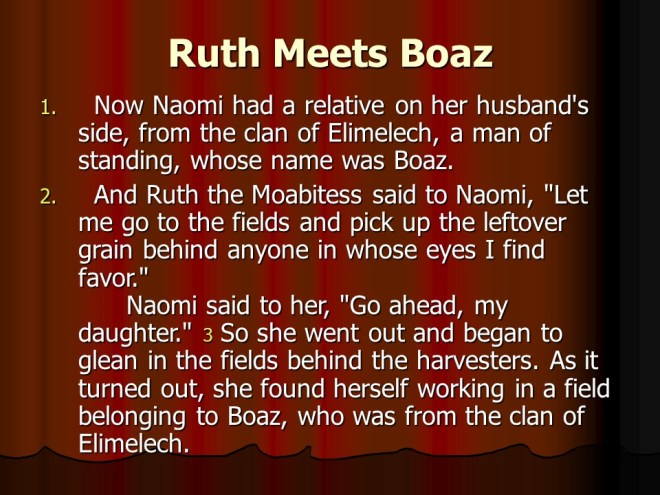 Ruth 1. Elimelech’s family went to Moab, and all the men in the family died. Naomi returned back to Israel with Ruth, a Moabite. The famous quote from Ruth 1: “Intreat me not to leave thee, or to return from following after thee: for whither thou goest, I will go; and where thou lodgest, I will lodge: thy people shall be my people, and thy God my God:”.