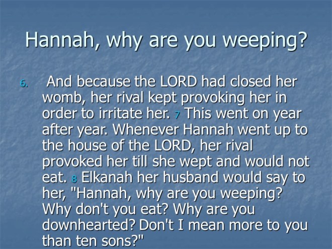 1 Samuel 2 starts out with Hanna’s Prayer, a beautiful piece of poetry. Then is recorded the story of the wicked sons of Eli, how they took and ate the fat that was supposed to be burned! It tells of Samuel’s childhood ministry and finally a man of God gave a prophecy against Eli’s household; both his wicked sons would die on the same day.