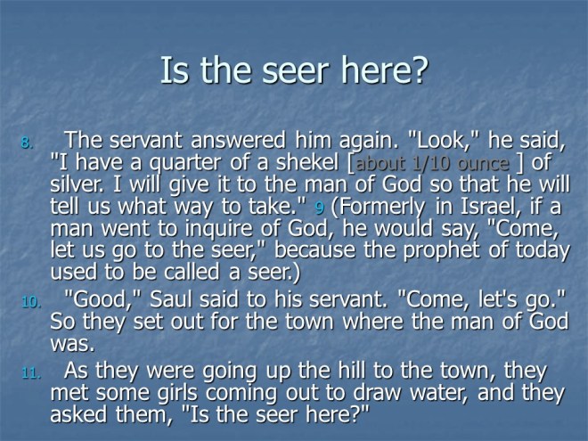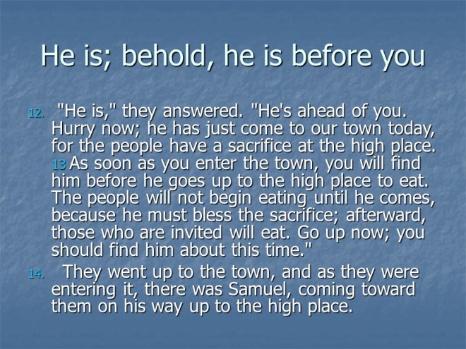 1 Samuel 9. Saul was a tall and handsome man, his father had lost some donkeys, so he sent Saul and his servant to look for them. Not finding them for three days they went to the prophet Samuel, God told Samuel to meet them, they met up, and so Saul was chosen to be King.