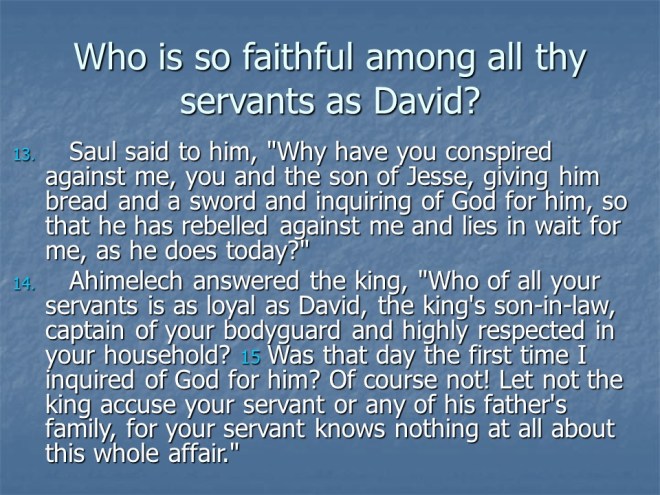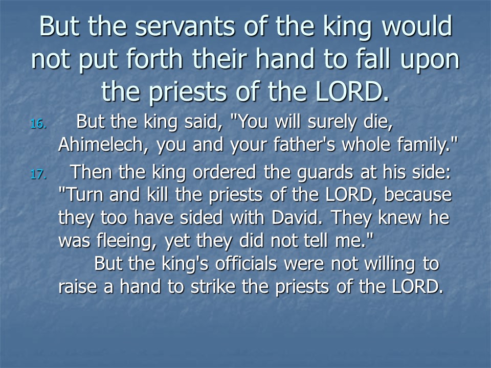 1 Samuel 22. David gathered four hundred men and went back into Judah. Because the LORD’s priests had helped David, Saul had Doeg the Edomite murder the priests, eighty-five in all.