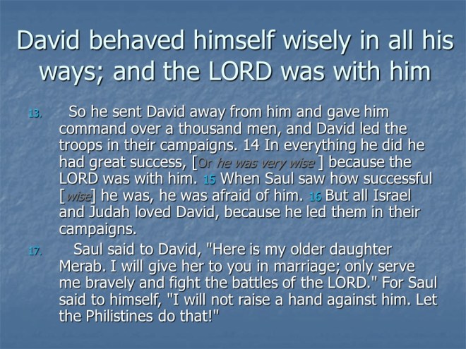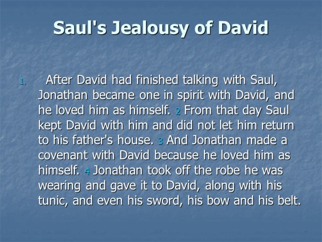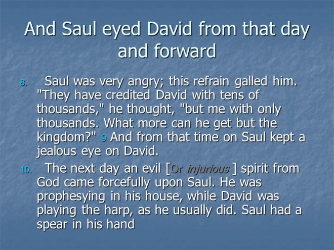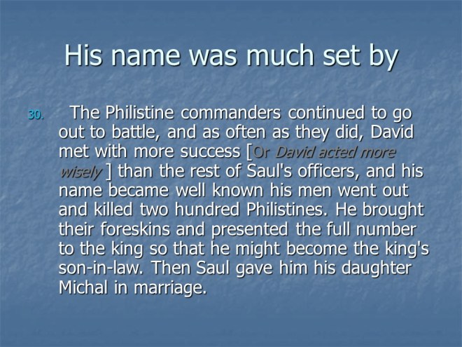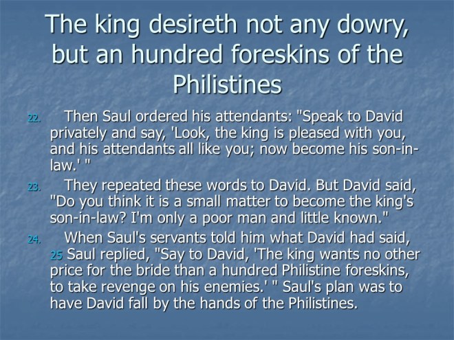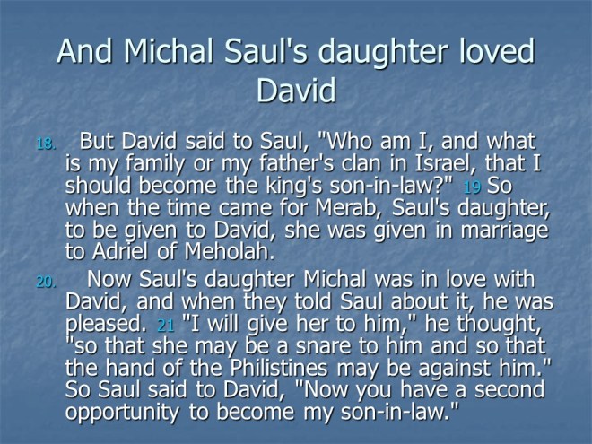 1 Samuel 18. Saul began to resent David, and no wonder, women started chanting “Saul hath slain his thousands, and David his ten thousands.” Saul’s daughter Michal fell in love with David, and Saul let them marry after a rather unusual dowry, but he became more and more suspicious and afraid of David.