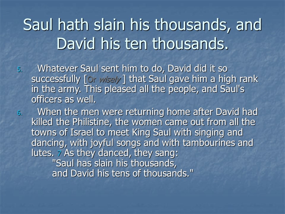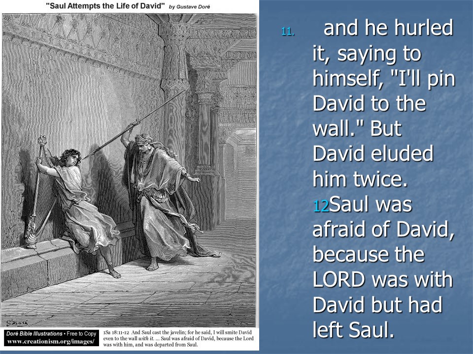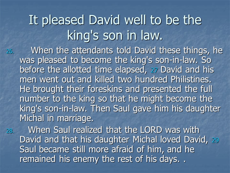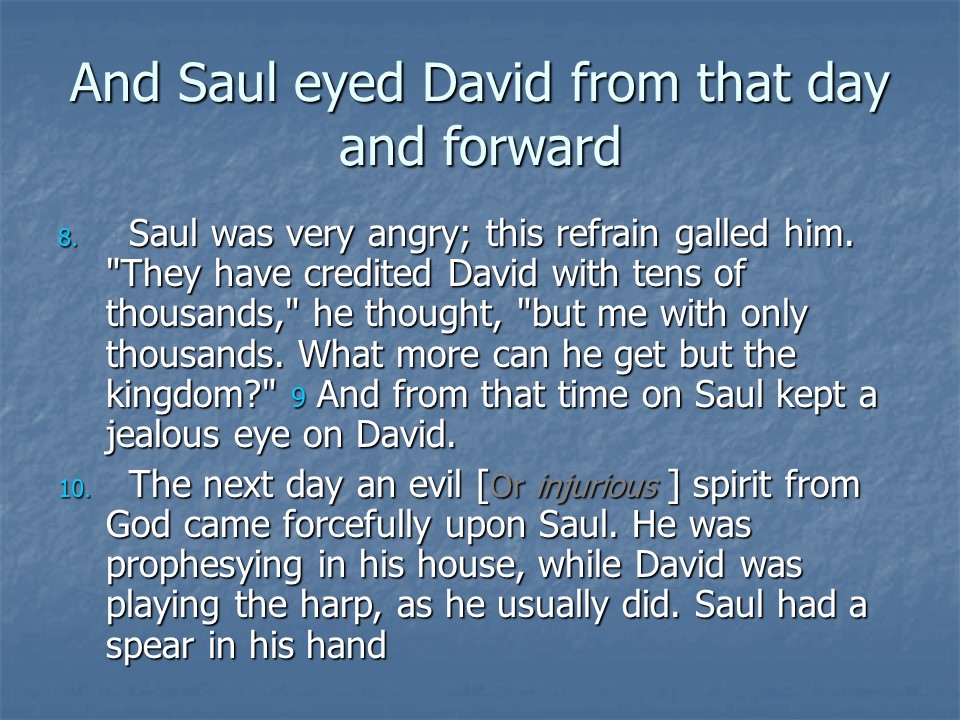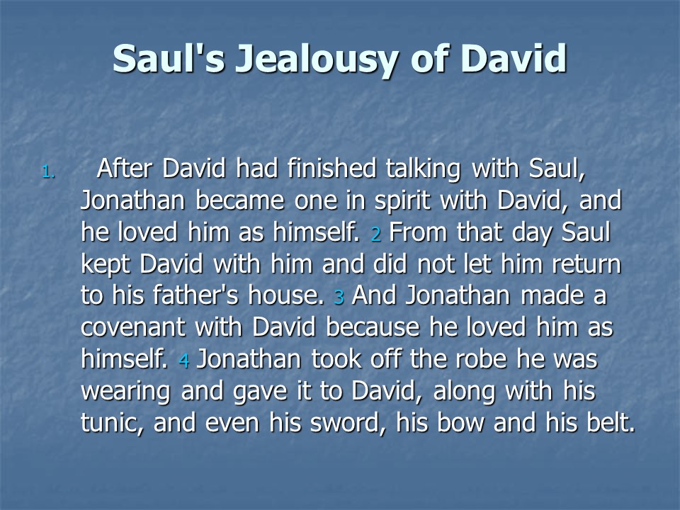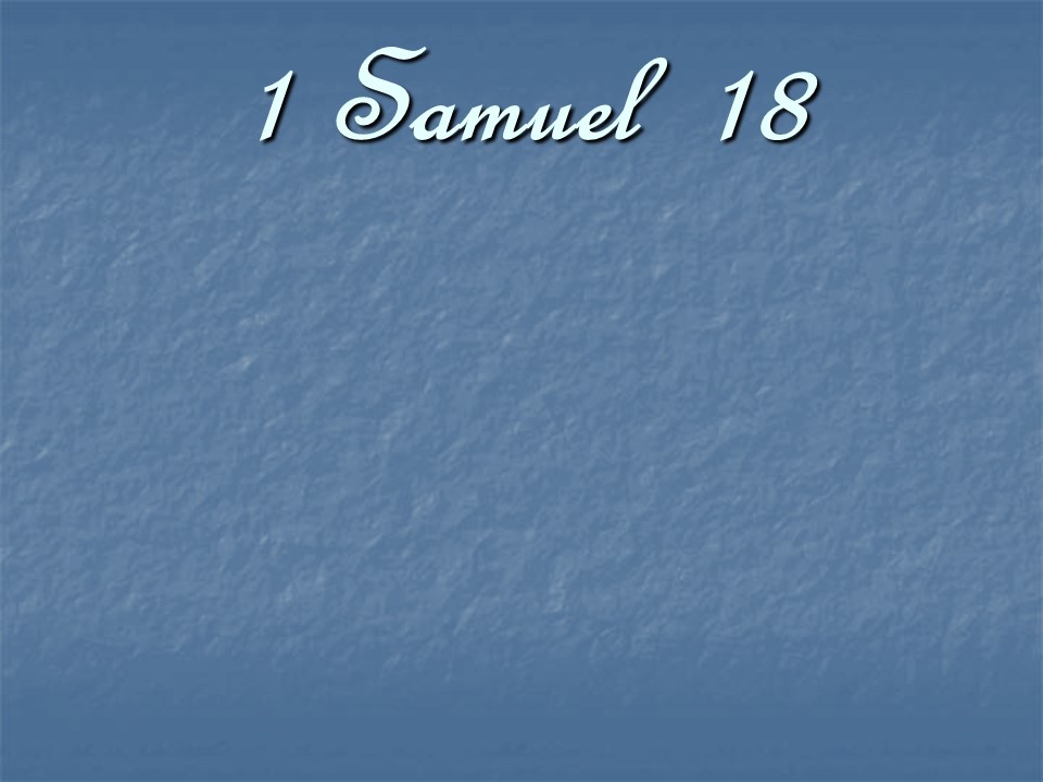 1 Samuel 18. Saul began to resent David, and no wonder, women started chanting “Saul hath slain his thousands, and David his ten thousands.” Saul’s daughter Michal fell in love with David, and Saul let them marry after a rather unusual dowry, but he became more and more suspicious and afraid of David.