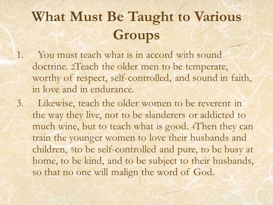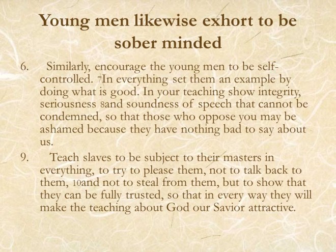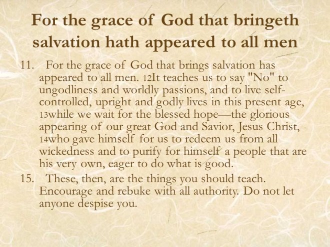 Titus 2. The Apostle Paul wrote to Titus that in order to have a sound church he must teach sound doctrine. And it is all done through saving grace. Quote to remember: “Looking for that blessed hope, and the glorious appearing of the great God and our Saviour Jesus Christ;Who gave himself for us, that he might redeem us from all iniquity, and purify unto himself a peculiar people, zealous of good works.”