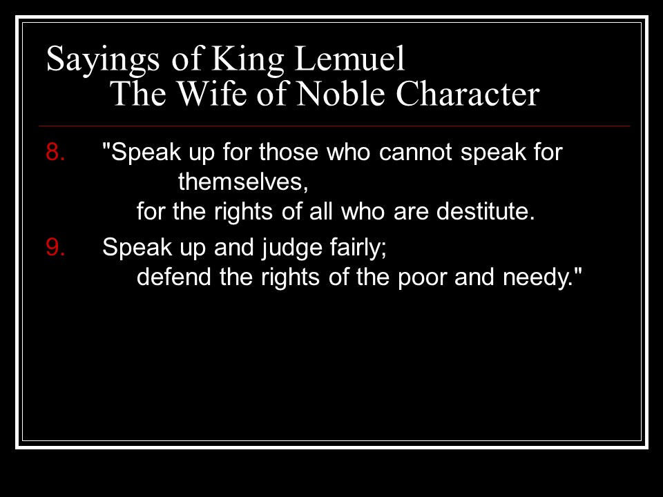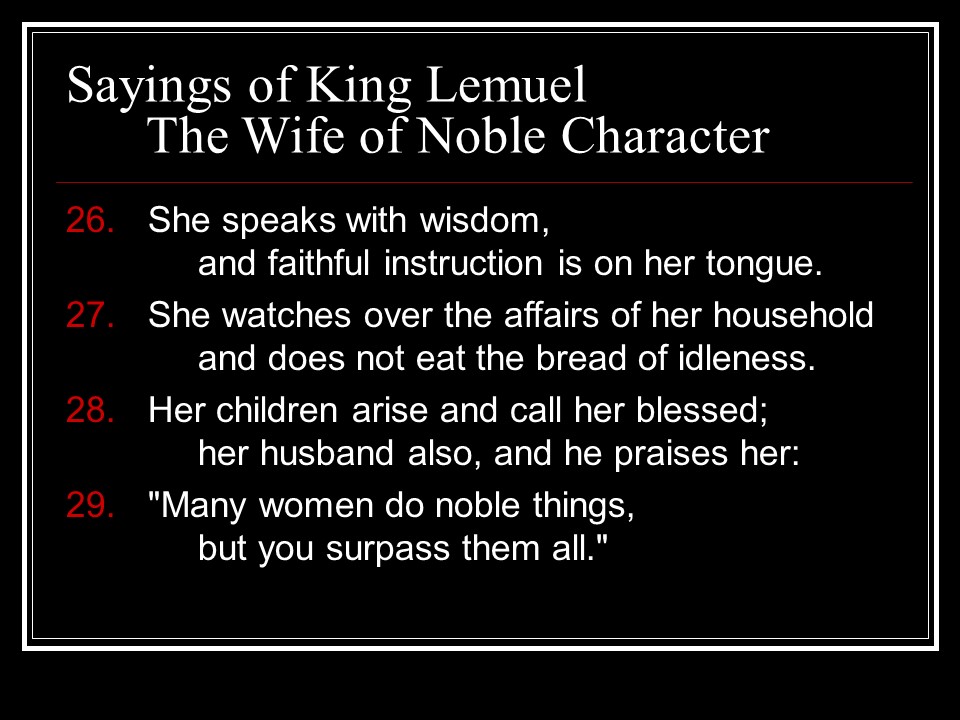 Proverbs 31. The sayings of King Lemuel. The book of Proverbs ends up with “The Wife of Noble Character”, and every day I thank the Lord for my wife of 56 years. Lives would have been quite different (three children and seven grandchildren would not exist at all) if God had not brought us together.