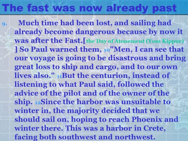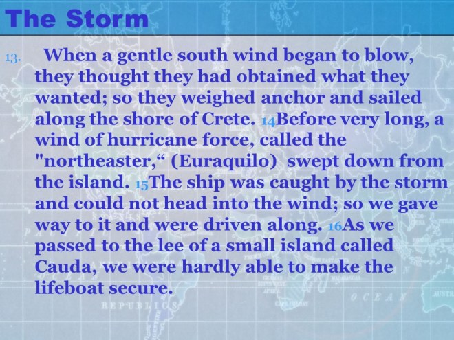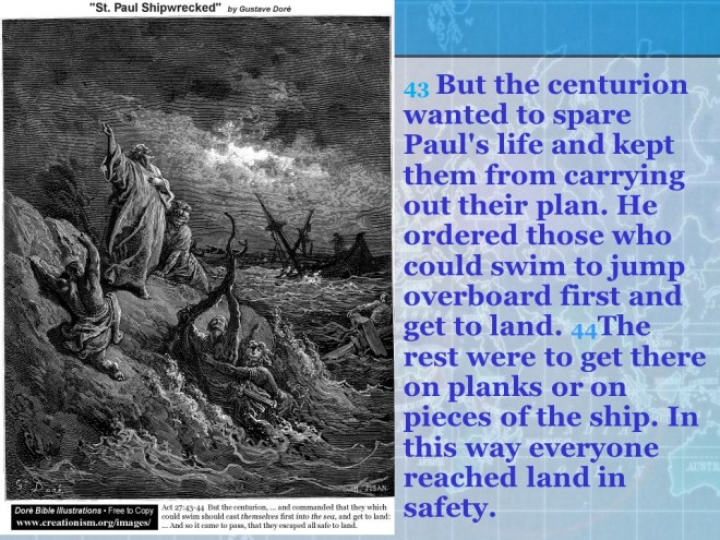 Acts 27:13-44. Against better advice from God via Paul the captain and Centurion ignored Paul’s warning, and sure enough a great storm grew up and they were shipwrecked on Malta, but all got safely ashore.