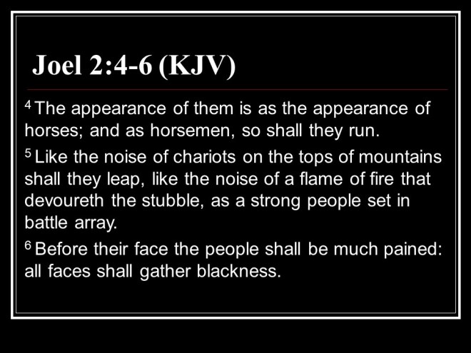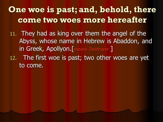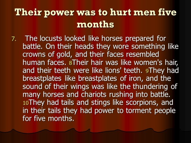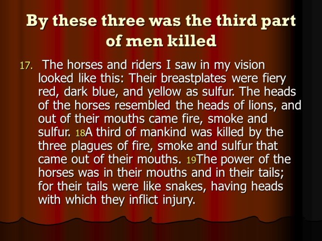 Revelation 9. By now we are deep into the last half of the tribulation, the fifth trumpet sounded and the locusts from the bottomless pit are released. Then the sixth trumpet sounded, featuring the angels from the Euphrates doing horrendous deeds. An army of two hundred million mounted troops were released to kill a third of mankind. When the Apostle John wrote this the total world population was about 250 million!