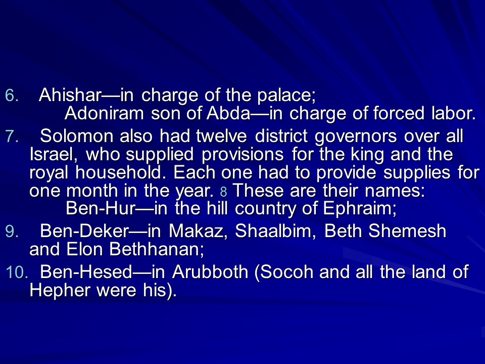 1 Kings 2. David gave his final instructions to Solomon, to whom he should show kindness and to whom he should not, and then David died. Solomon Executed Adonijah, exiled Abathar, executed Joab and Shimel, and showed kindness to the ones that had helped David. The kingdom was then firmly secured as Solomon’s.