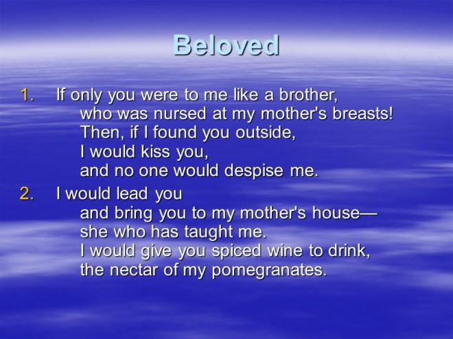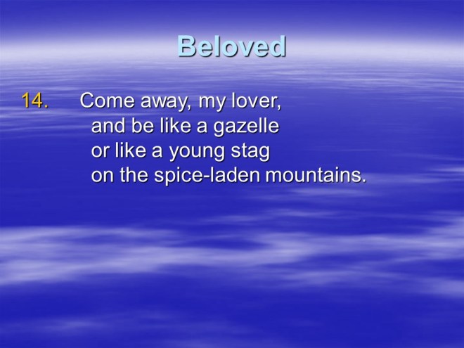 Song of Solomon 8. And so is love renewed in Lebanon. This shows that God’s love is complete, and does indeed include the sensual. This too is the gift of God.
