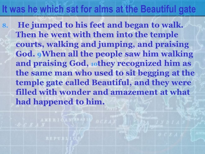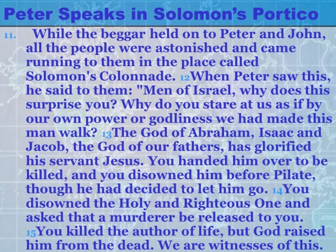 Acts 3, Peter heals a crippled man, the Beautiful Gate, Peter Preaches at Solomon’s Portico. Acts 3, Peter heals a crippled man, the Beautiful Gate, Peter Preaches at Solomon’s Portico.