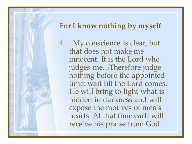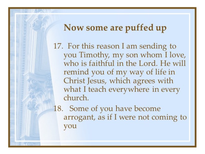 1 Corinthians 4. The Apostle Paul reminded the Corinthians they are servants of Christ, stewards of the mysteries of God and fools for Christ’s Sake. Then Paul urged them to imitate him and not be arrogant. “For the kingdom of God is not in word, but in power.”