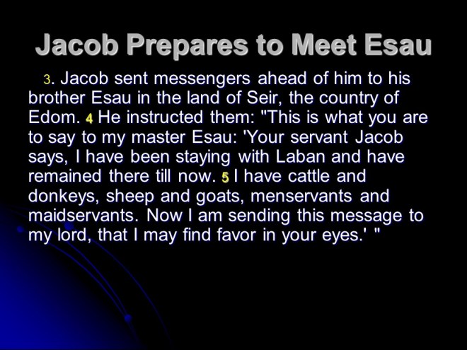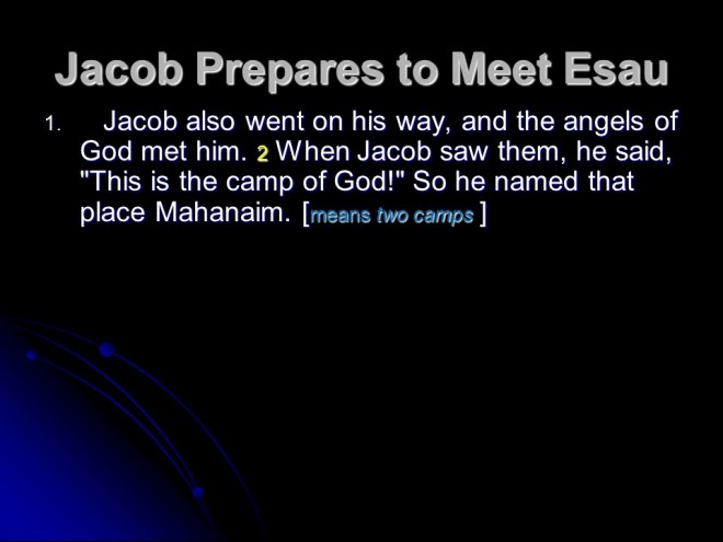 Genesis 32, Jacob prepares to meet with Esau, struggles with God. The angels of God are everywhere for those whose eyes are opened. Jacob is trying to pacify Esau with gifts. The Ford of Jabbok. Jacob had his plans, but God….