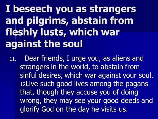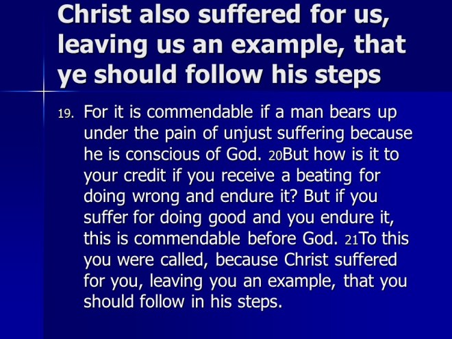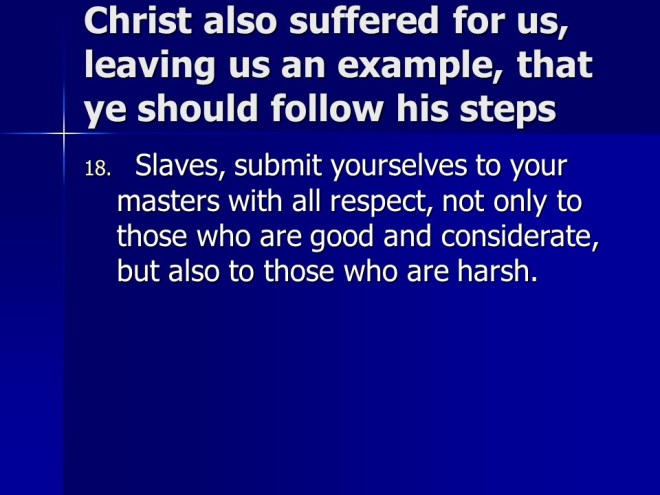 1 Peter 2:11-25. For the Lord’s sake submit to all government (even the Romans) and to your masters (employers).