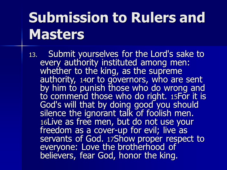 1 Peter 2:11-25. For the Lord’s sake submit to all government (even the Romans) and to your masters (employers).