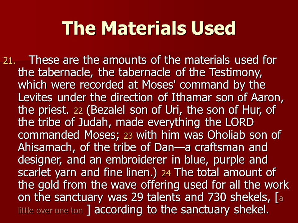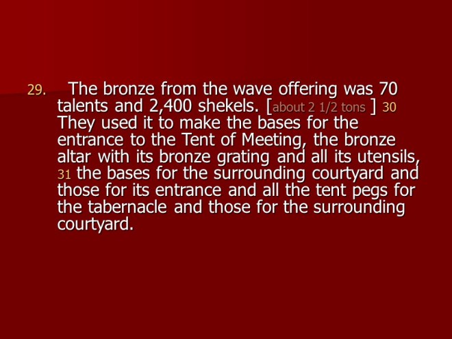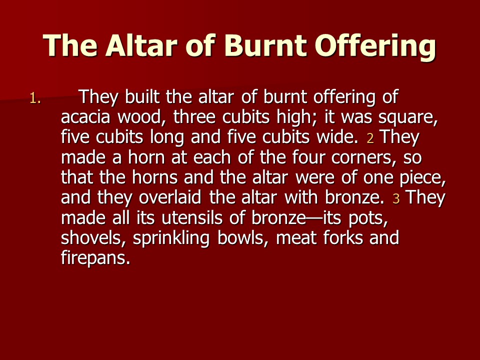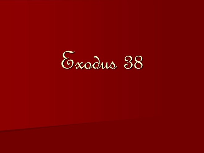 Exodus 38, the Altar of Burnt Offering, the Wash Basin, the Courtyard, materials used. Exodus 38, the Altar of Burnt Offering, the Wash Basin, the Courtyard, materials used.