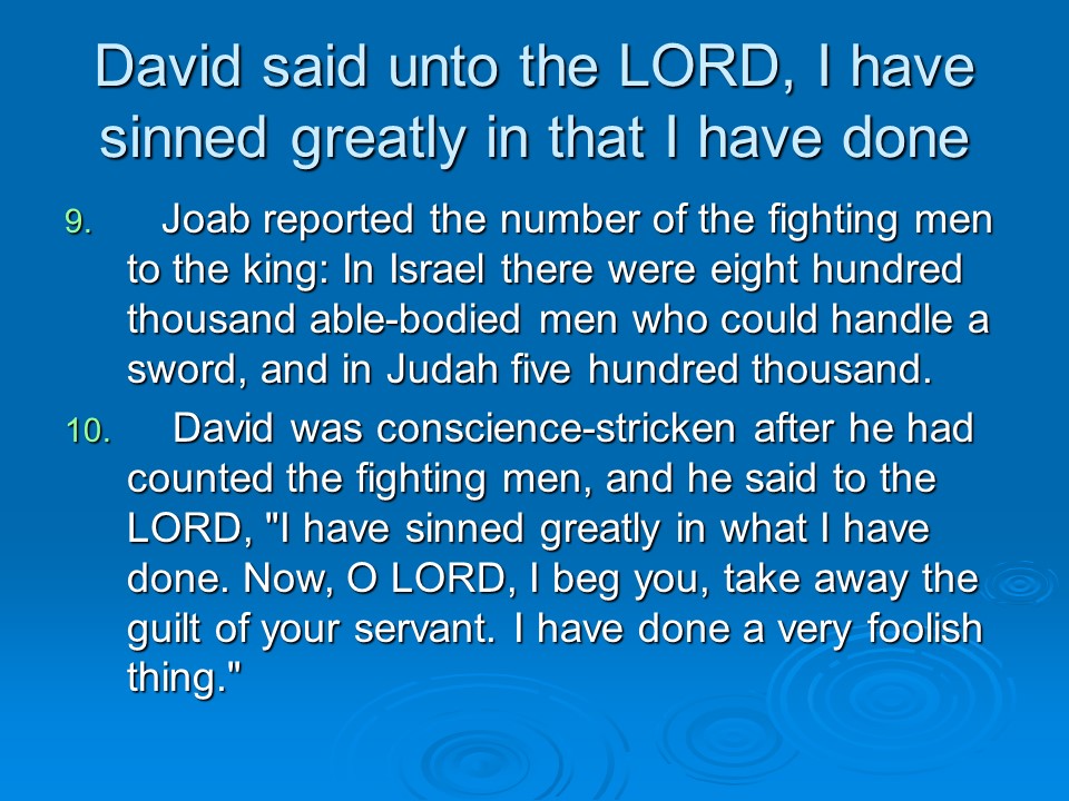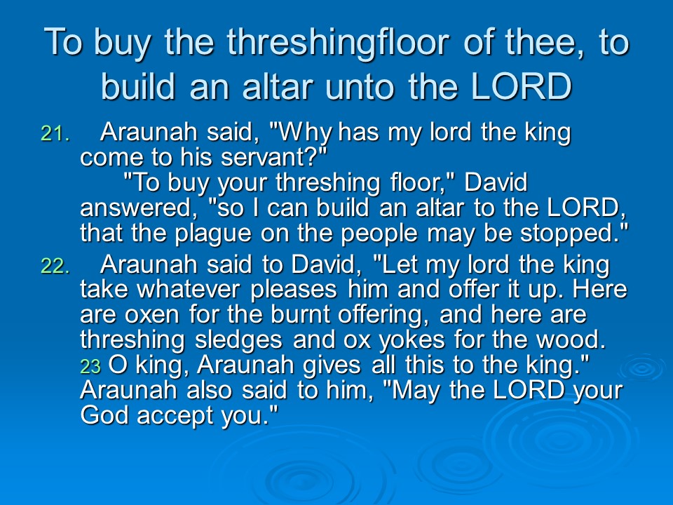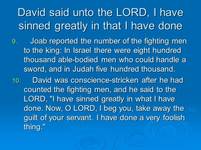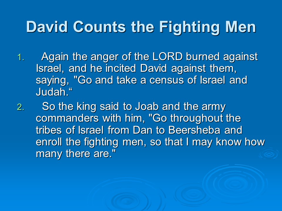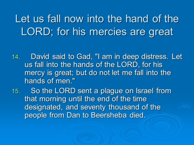 2 Samuel 24. David took a census of Israel and Judah,which was a sin that had to be punished. David chose to fall into the hands of the LORD, so the angel of death ravaged the land for three days until he came to the threshing floor of Araunah the Jebusite. David built an altar there and sacrificed.