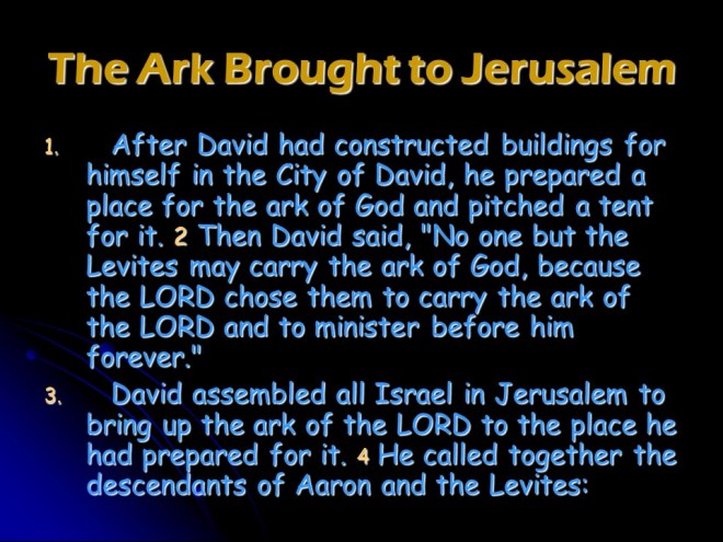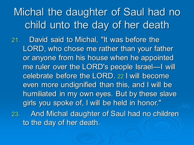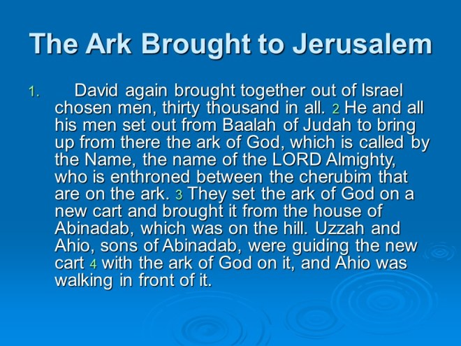 1 Chronicles 15. The Ark was brought to Jerusalem. When David’s wife Michal, daughter of Saul saw David dancing in the street at the joyous occasion, she despised him.