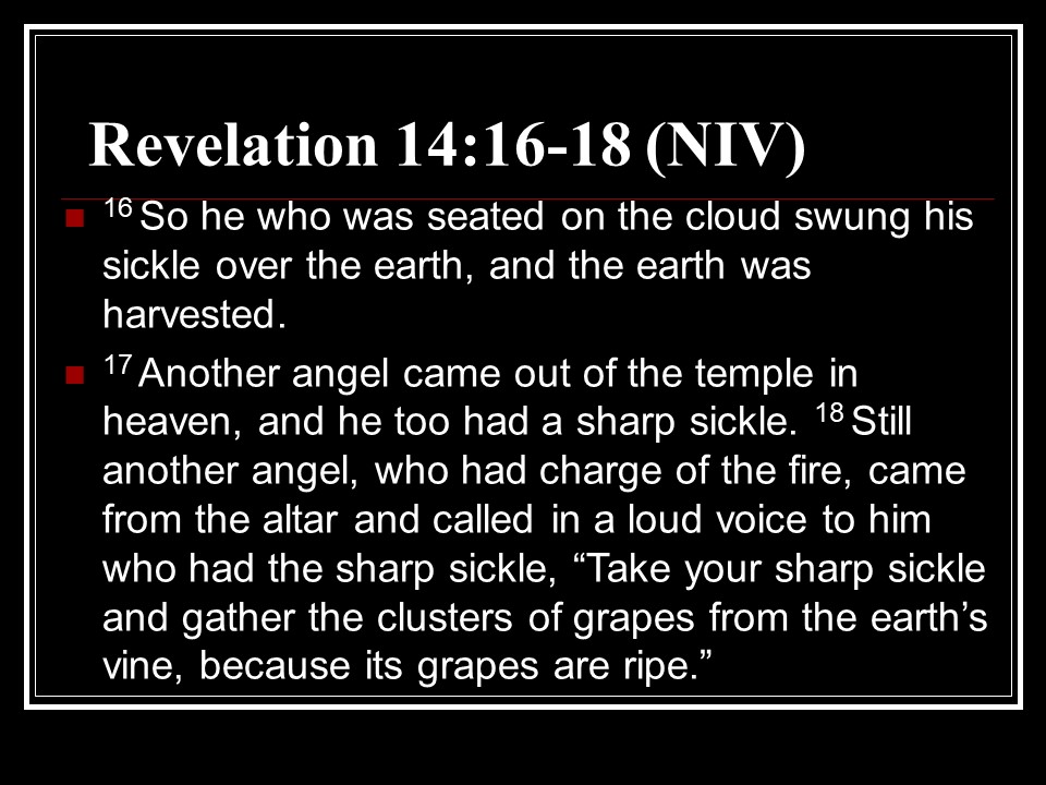 Revelation 14. The apostle John again saw the vision of the lamb and the 144,000 Jewish male virgins, after which he saw and heard three angels making their proclamation. And then came time to proclaim the reaping of the earth’s harvest, the Grapes of Wrath. This vision is later portrayed in the Battle Hymn of the Republic.