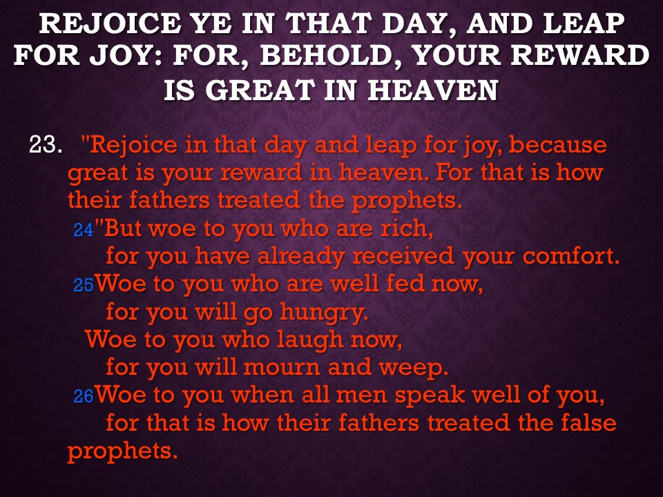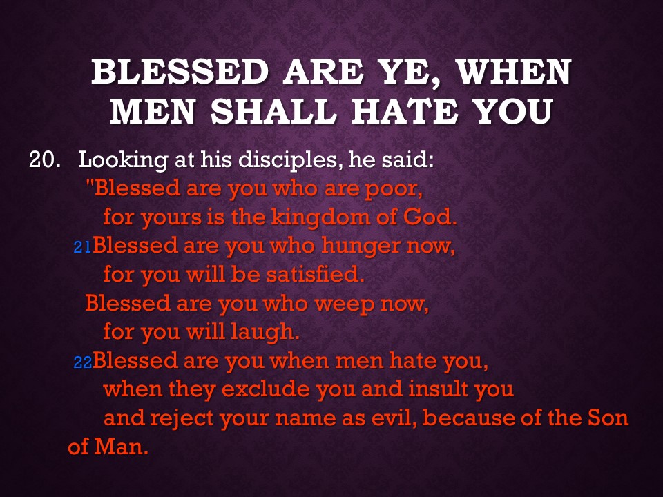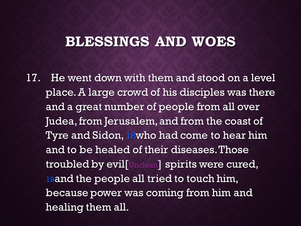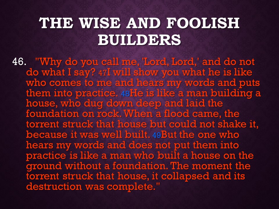 Luke 6:17-49. Luke recorded a shorter version of the Beatitudes than is found in the gospel of Matthew. Jesus added: Love your enemies, do not judge, a tree is known by its fruit, and finally he told the parable of the foolish and the wise builder.