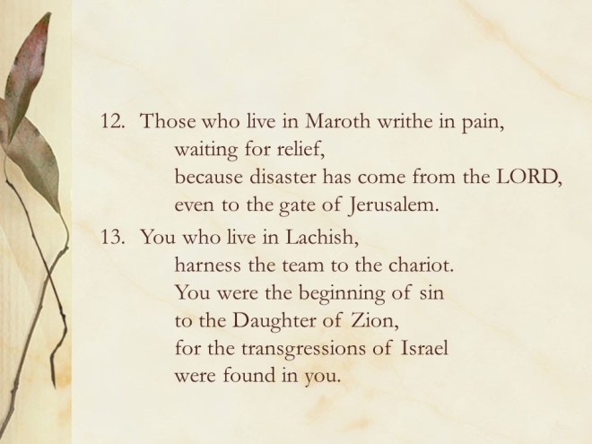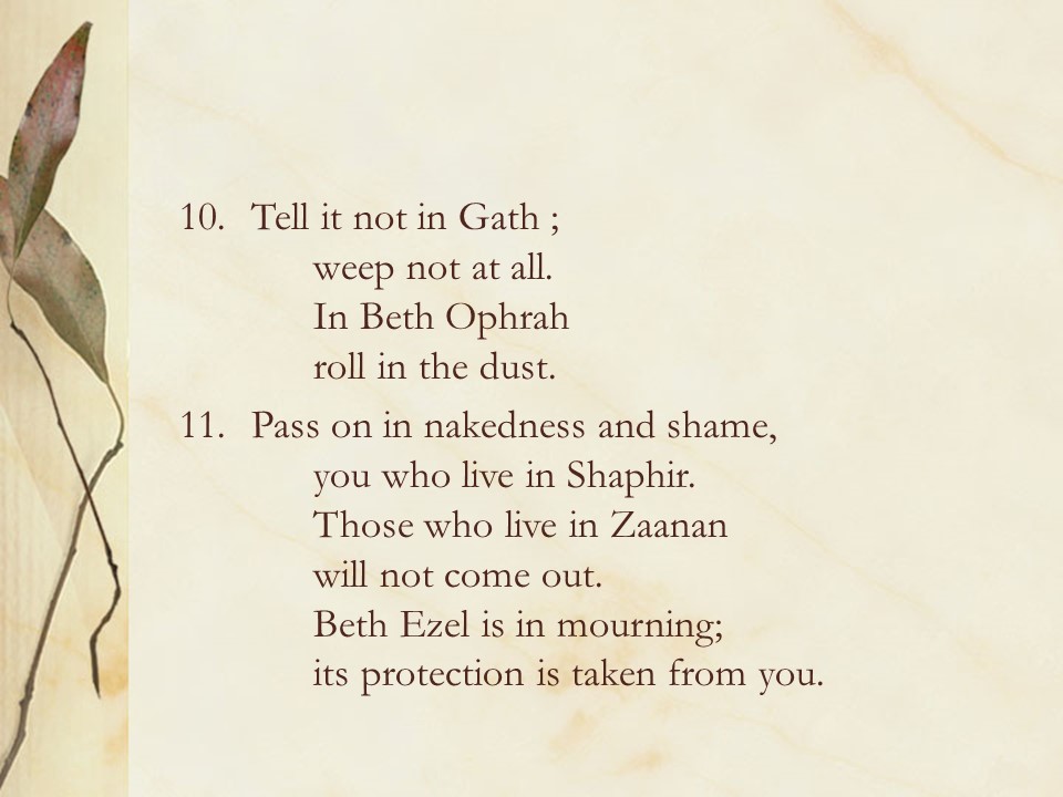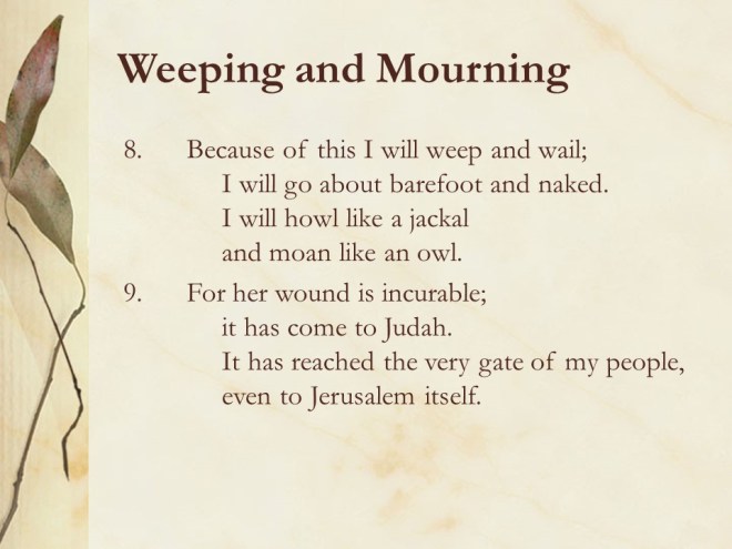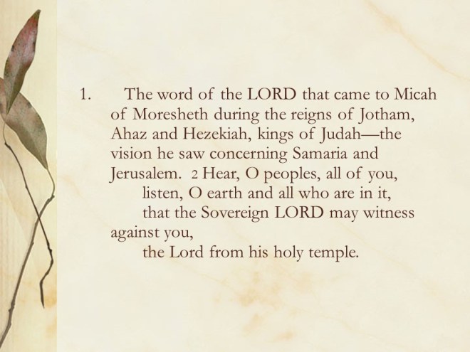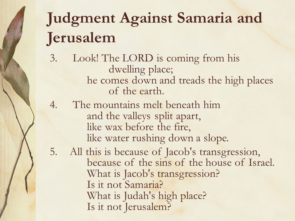 Micah 1. The prophet told of the coming judgment on Israel with mourning for Israel and Judah.