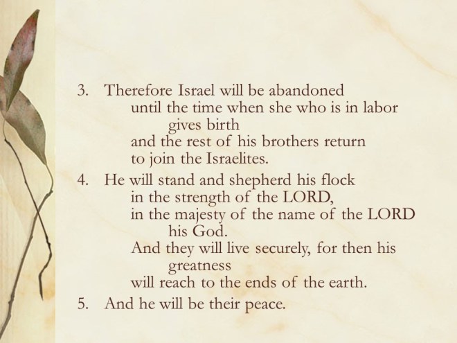 Micah 5. The promise of the coming Messiah: “But thou, Bethlehem Ephratah, though thou be little among the thousands of Judah, yet out of thee shall he come forth unto me that is to be ruler in Israel; whose goings forth have been from of old, from everlasting.” But first, God promised punishment of Israel’s injustice.