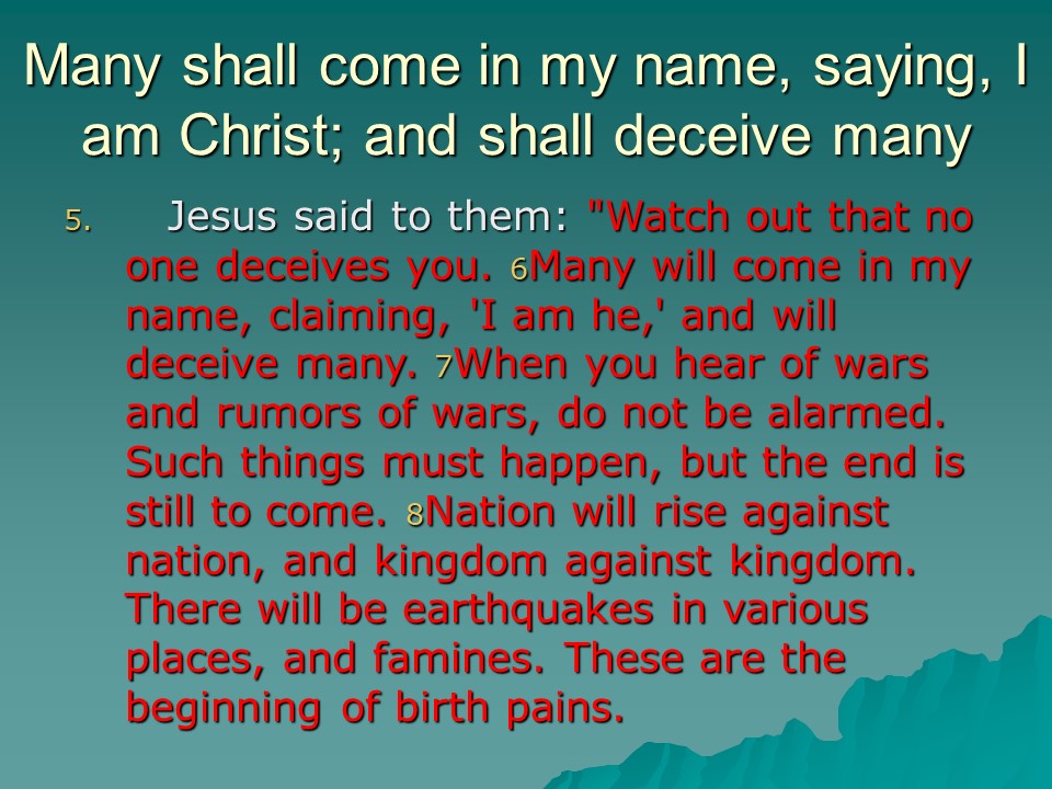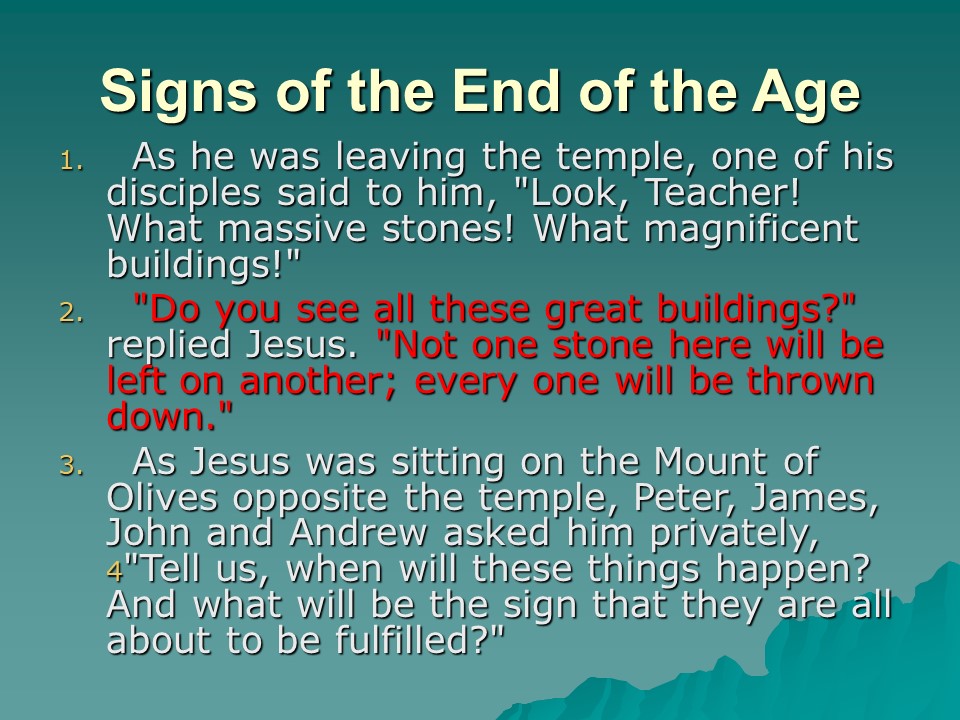 Mark 13, Signs of the End of the Age, the Great Tribulation, the Coming of the Son of Man, the Fig Tree, the Day and Hour unknown.