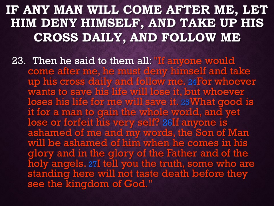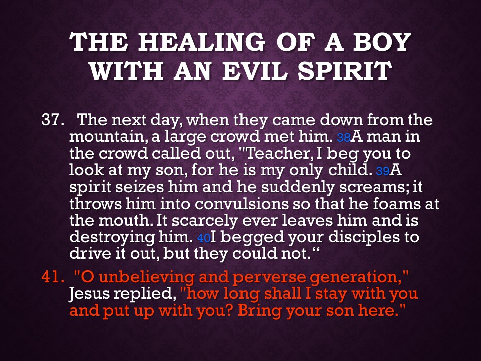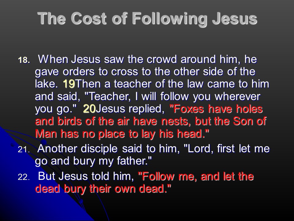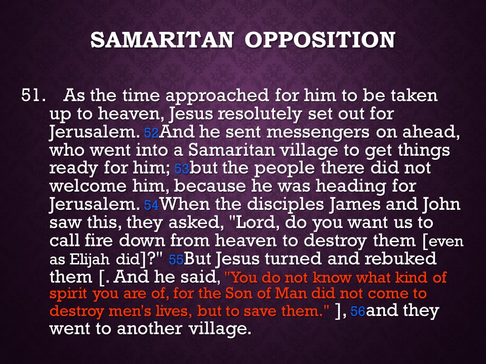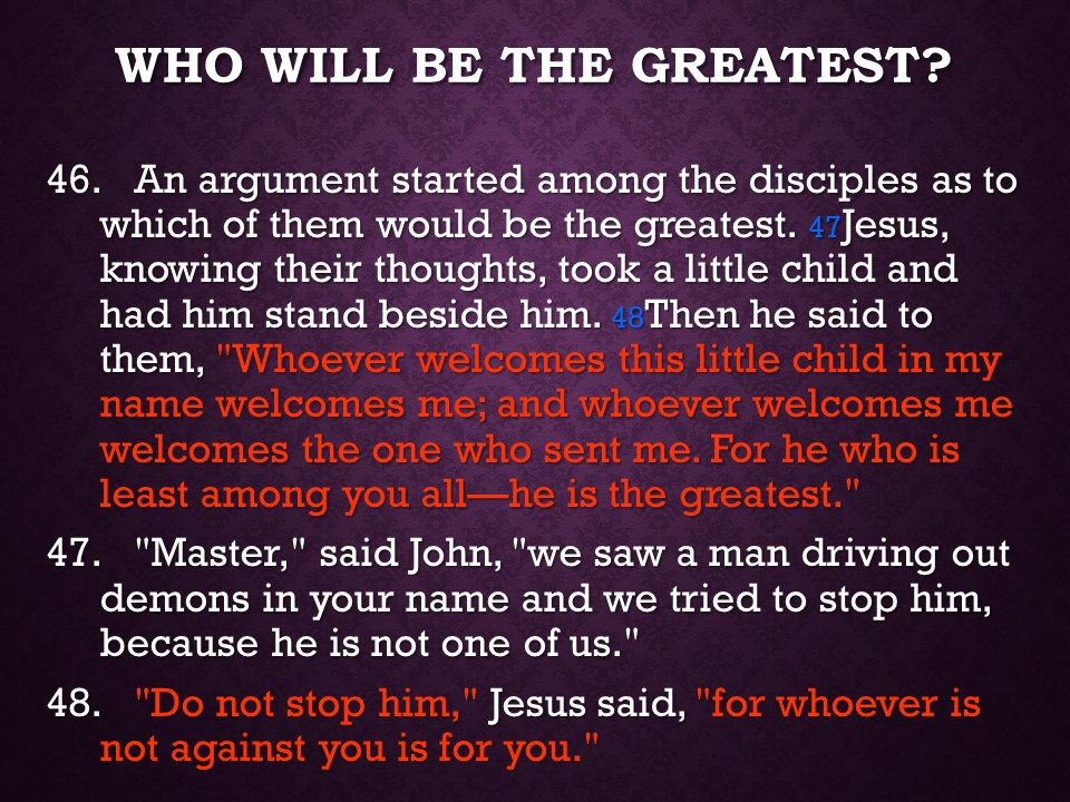 Luke 9:37-62. A day after the Transfiguration on the mount Jesus healed a boy with an evil spirit. The disciples argued about who would be the greatest, and as an object lesson Jesus picked up a little child and said: “He who is least among all, he is the greatest“. Jesus spoke against sectarianism, and on their way to Jerusalem they met Samaritan opposition. Finally Jesus told the disciples there is a cost of following Him.