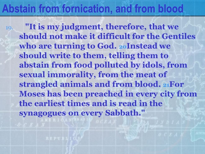 Acts 15. Much ado about circumcision. Then came the Council at Jerusalem, which led to  the Jerusalem decree. (in short: Abstain from fornication and from blood). Barnabas and Paul argue about Mark, so they split up, and Paul took Silas and embarked on the second missionary journey.
