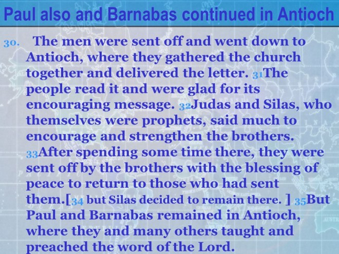 Acts 15. There was much ado about circumcision, and the believers decided to decide the issue at the Council at Jerusalem, which led to the Jerusalem decree, (in short: Abstain from fornication and from blood). Barnabas and Paul argued about Mark, so they split up, and Paul took Silas and embarked on the second missionary journey.
