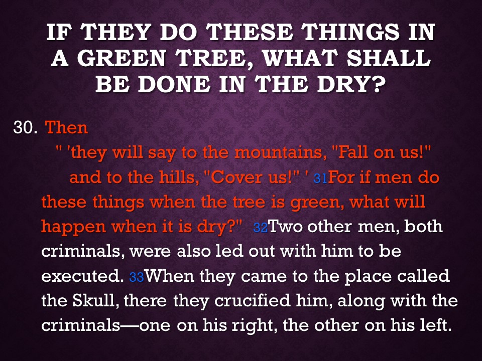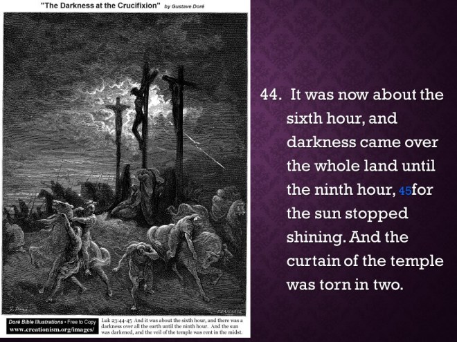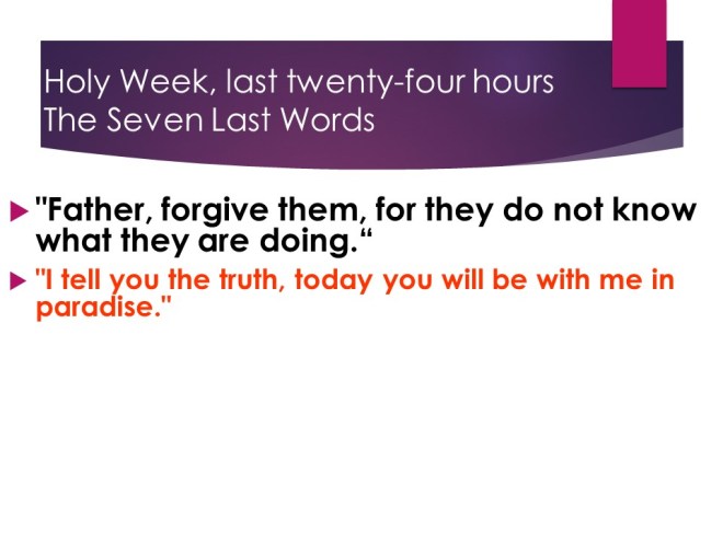 Luke 23:26-56, . On the second most important day in the Christian calendar Jesus was sentenced to be crucified, was forced to carry his own cross but was too exhausted from the floggings. On the cross Jesus said the famous “Seven Last Words”, (taken from the four gospels), then he died and was buried before sunset.
