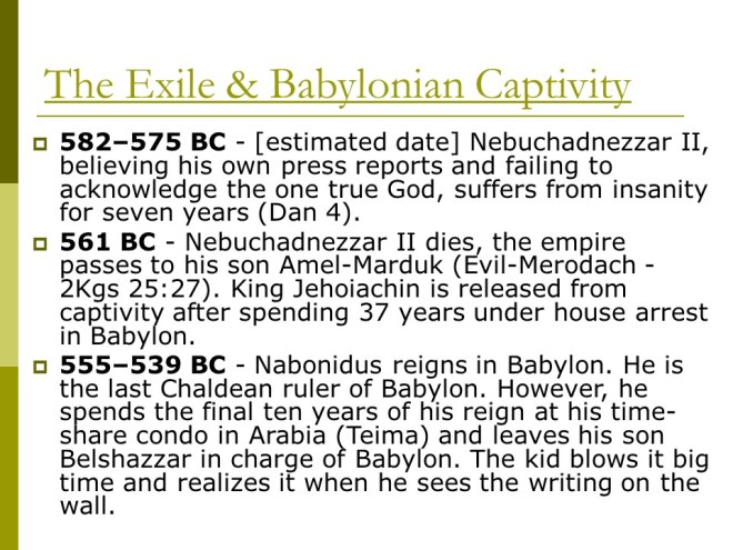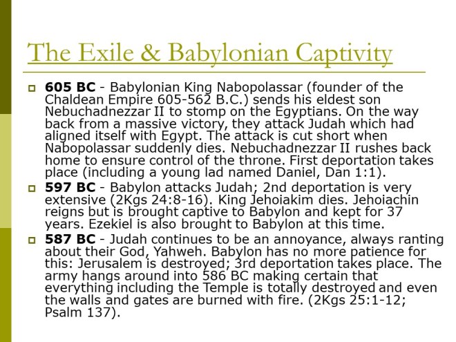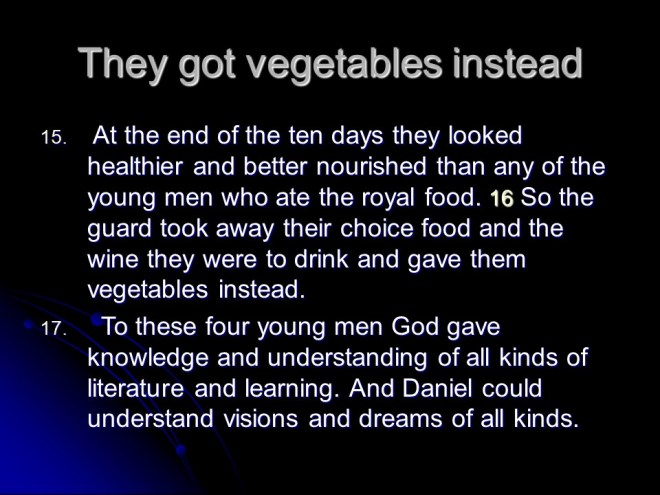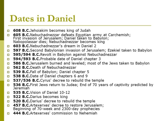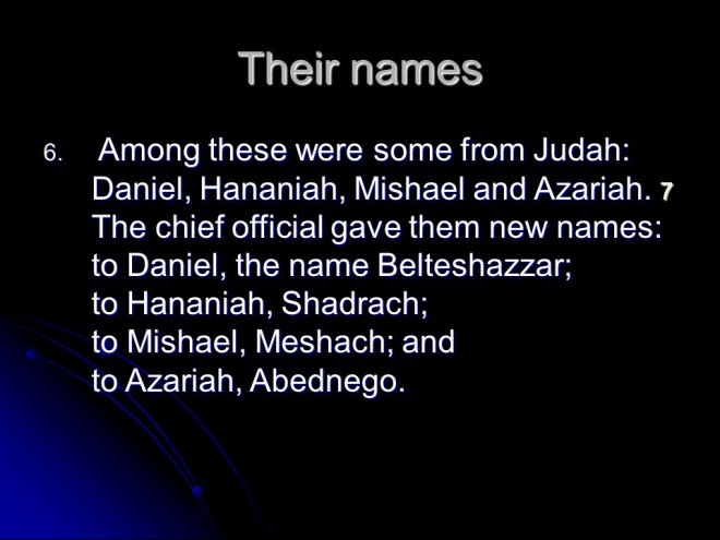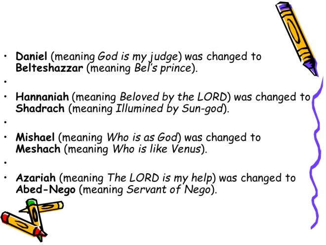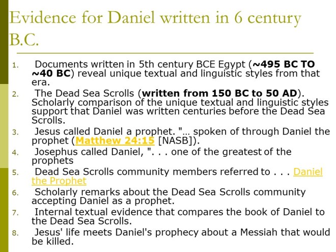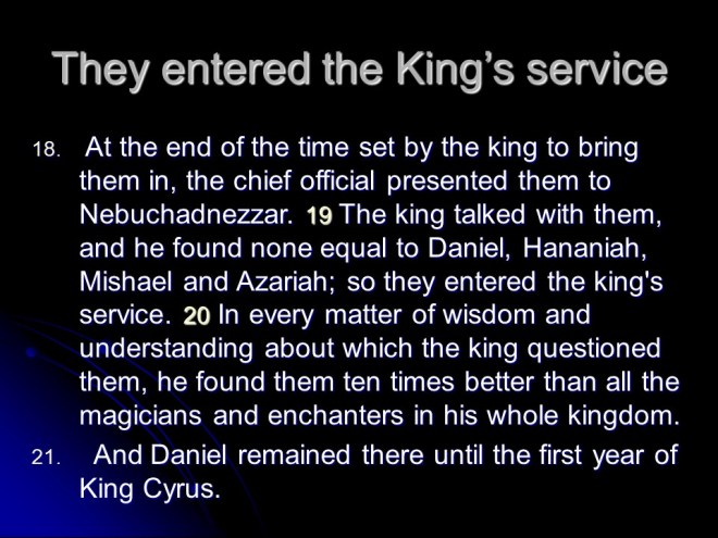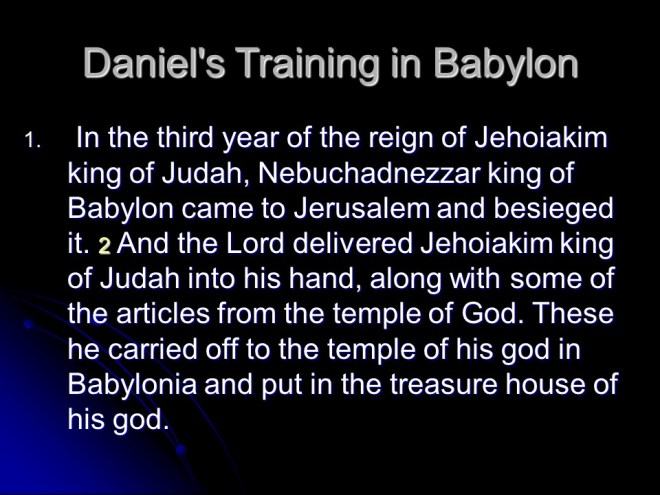 Daniel 1. This book is most probably written by Daniel during his life. This has been questioned because of the many, accurate prophesies in it. It begins with Daniel and three other Hebrew children as they are taken into the Babylonian King’s administration as interns, and are given new names. They refuse the non- kosher diet and pass the test.