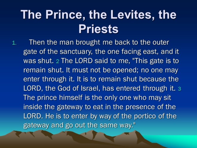 Ezekiel 44. The East Gate is to remain shut (this is important prophecy), only the Prince may sit inside the gate. Only clean people are are admitted to the temple, and there are many laws concerning priests.