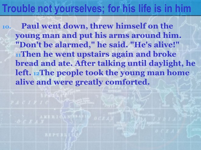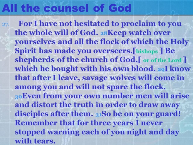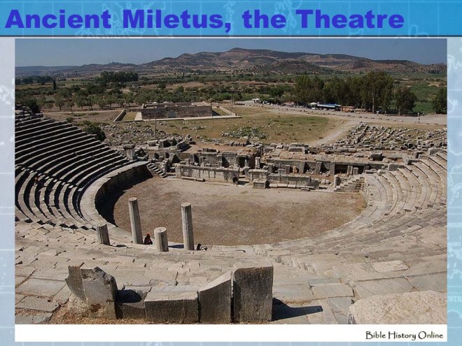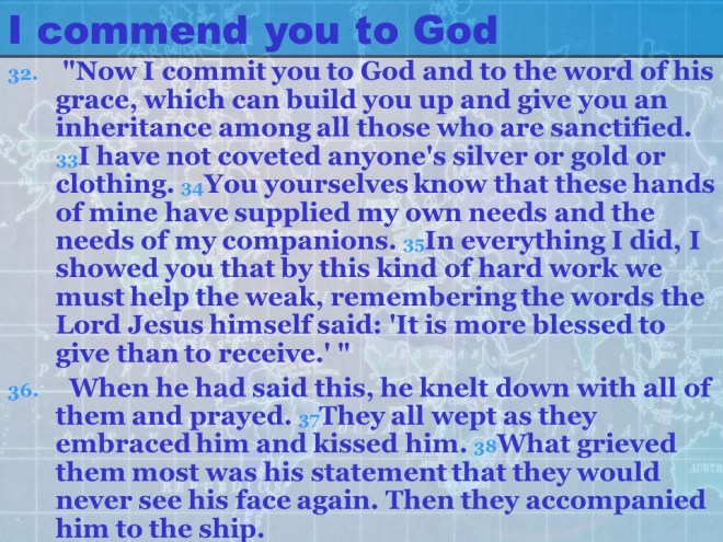 Acts 20:17-38. From Miletus the Apostle Paul called the Ephesian Elders and when they arrived he exhorted them, said farewell and told them he would never see them again.