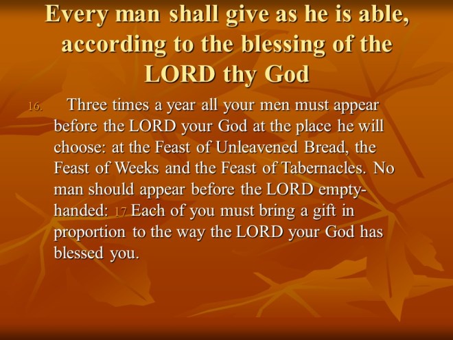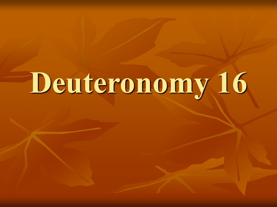 Deuteronomy 16 declares how to celebrate the Passover, the Feast of Weeks and the Feast of Tabernacles. Bring an offering, no one can go empty handed. Appoint Judges so justice can be properly administered. Do not worship any Asherah poles ever and do not put up any sacred stones.