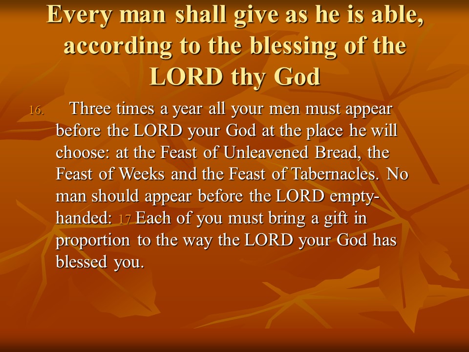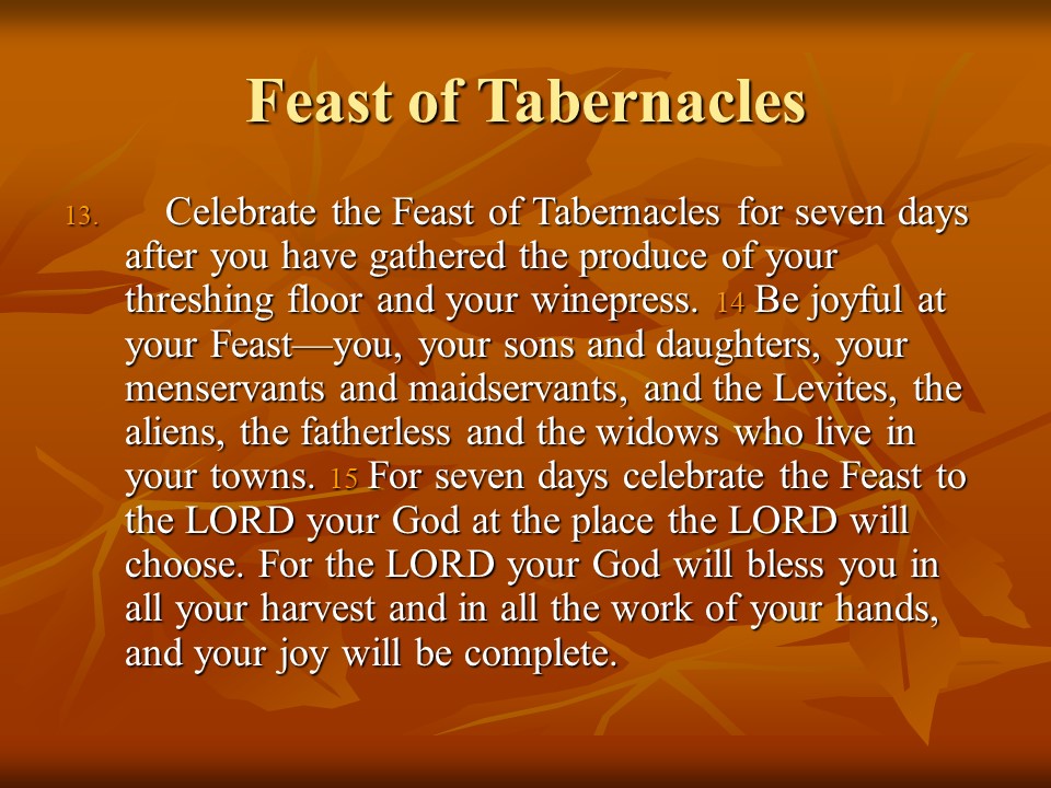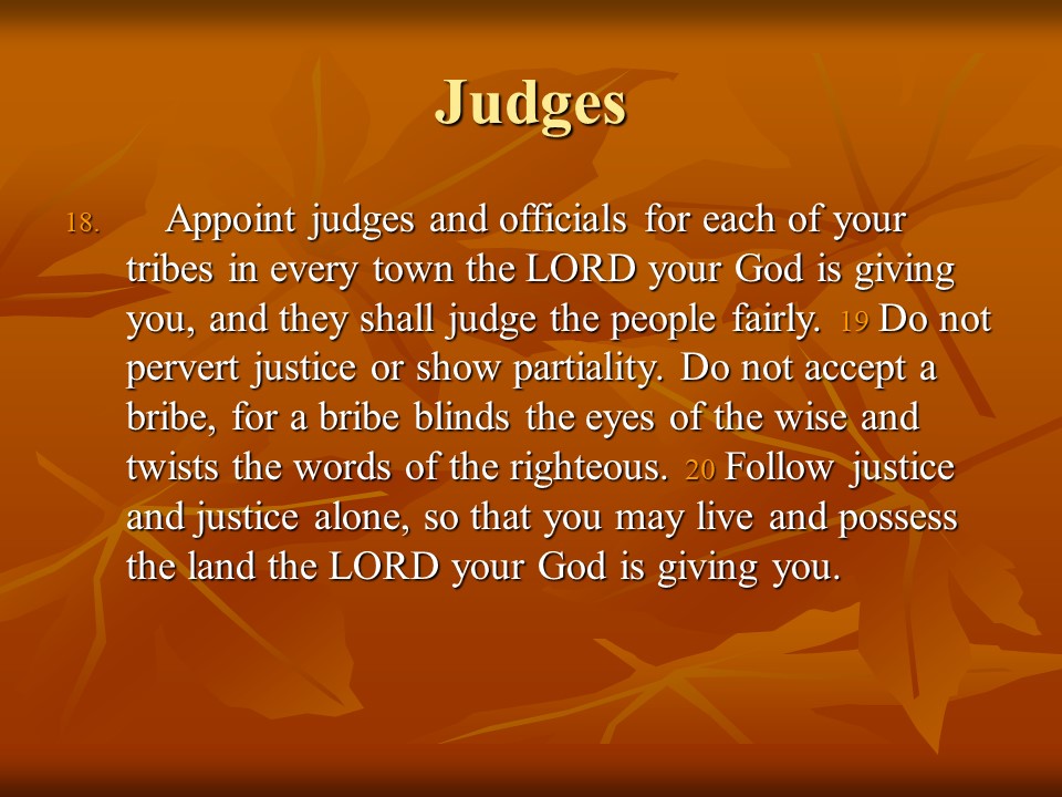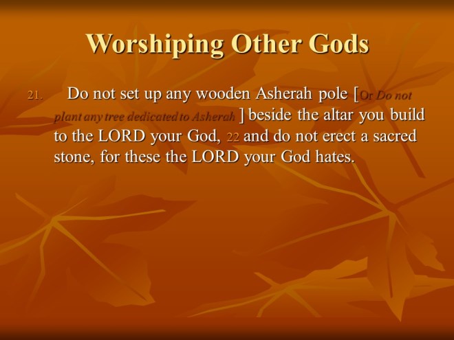 Deuteronomy 16 describes in detail how to celebrate the Passover, the Feast of Weeks and the Feast of Tabernacles. Bring an offering, no one can go empty handed. Appoint Judges so justice can be properly administered. Do not worship any Asherah poles ever.